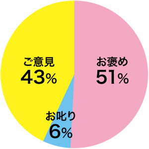 2024年度中に患者さんから頂いたご意見を集計した結果、おほめ51%、おしかり6%、ご意見43%という結果になりました。今年度は、おほめのお言葉を多く頂きました。また、貴重なご意見を参考に、今後もより良い医療とサービスの提供に努めて参ります。 2024年度の皆様から頂いたご意見の一部をご紹介するとともに、当院の対応につきましても併せて回答させていただきます。 |